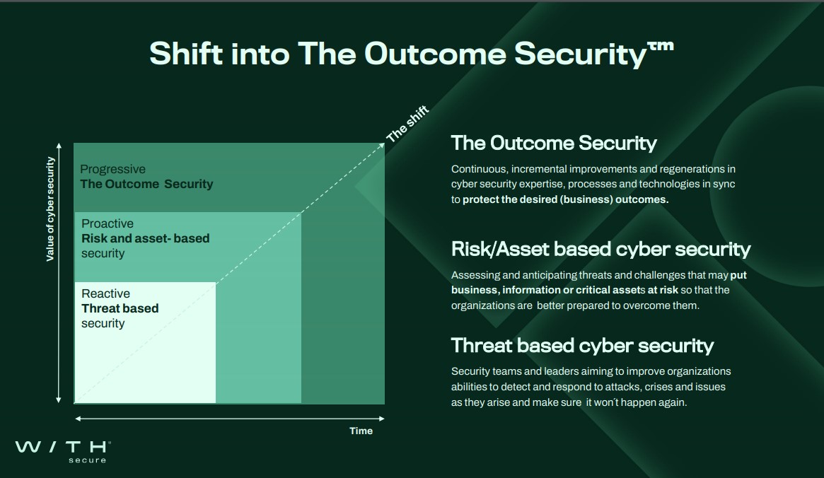 Certamente, ha riconosciuto Juhani Hintikka, si tratta di un percorso sul quale c’è ancora da lavorare, in quanto è necessario “cambiare prospettiva, passando da una sicurezza reattiva, ovvero basata sulle minacce, e proattiva, cioè basata sulla gestione dei rischi e degli asset, verso una idea più ampia, di tipo ‘progressive’, denominata Outcome Security”. Si tratta di una sicurezza che si focalizza sui risultati, gli outcome, non solo in termini strettamente di sicurezza, ma anche di business, attraverso miglioramenti continui e incrementali nelle competenze, nei processi e nelle soluzioni di sicurezza proprio per far fronte alle minacce in maniera predittiva.