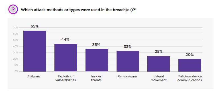 Più di una impresa su due (54%) afferma di aver riscontrato lacune contrattuali o tecniche negli accordi con i fornitori a seguito di un incidente di sicurezza, mentre nell’ultimo anno il 46% ha subìto una violazione originata da accesso di terzi. Sul fronte delle tecniche impiegate più di frequente per glia ttacchi cyber, il report riporta ai primi posti malware, ransomware, exploit di vulnerabilità e attacchi di lateral movement, con una percentuale del 65% che cita il malware come vettore principale e il 44% che riporta exploit puntuali di vulnerabilità.