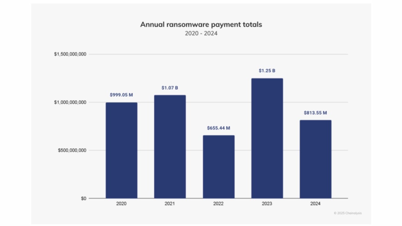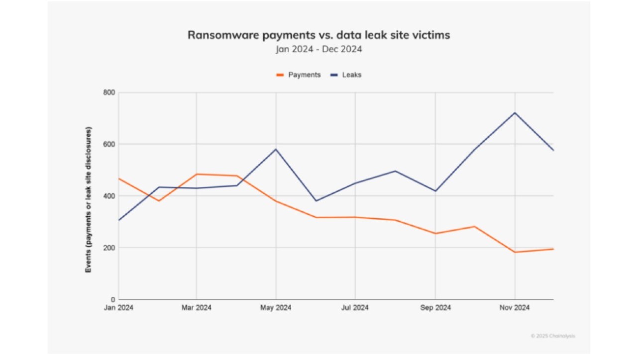 Nel 2024 i gruppi ransomware hanno incassato circa 813,55 milioni di dollari in pagamenti di riscatti: la cifra è in flessione del 35% rispetto al picco di 1,25 miliardi di dollari dell’anno precedente. Sulla carta questa sarebbe una buona notizia, perché da sempre gli esperti reputano che la profittabilità sia la maggiore leva di espansione degli attacchi. Il problema è che, nello stesso periodo, il numero totale di incidenti ransomware segnalati è cresciuto. Siamo pertanto di fronte a una situazione contraddittoria in cui il rapporto tra eventi e pagamenti è fortemente sbilanciato. I dati e la relativa analisi per comprendere le nuove dinamiche ransomware sono inclusi nel report 2025 Crypto Crime Report di Chainalysis.