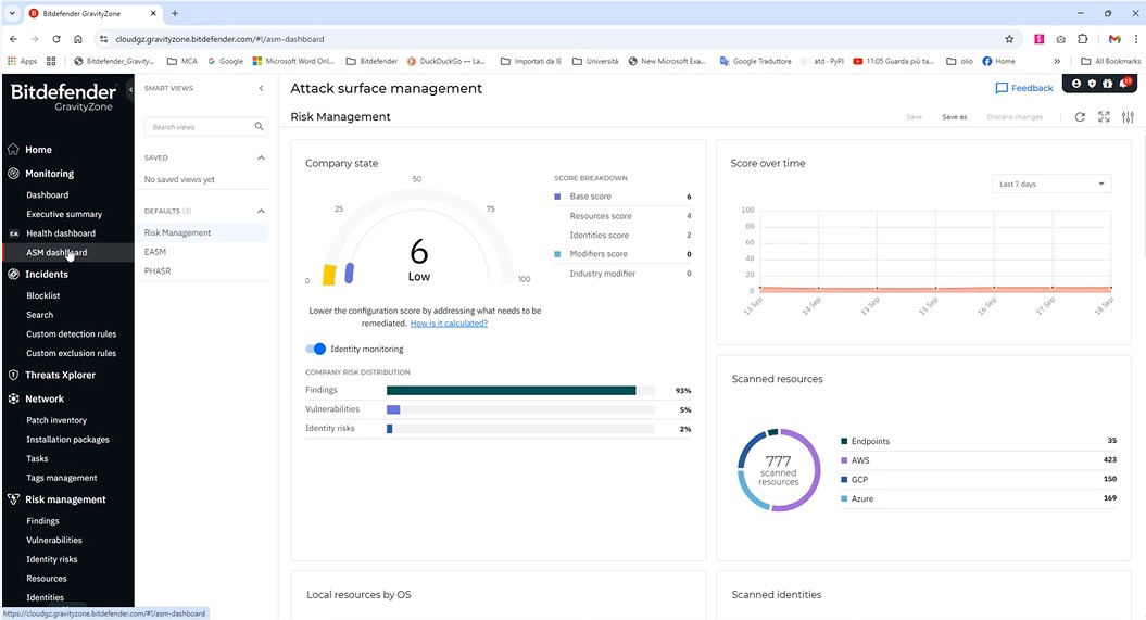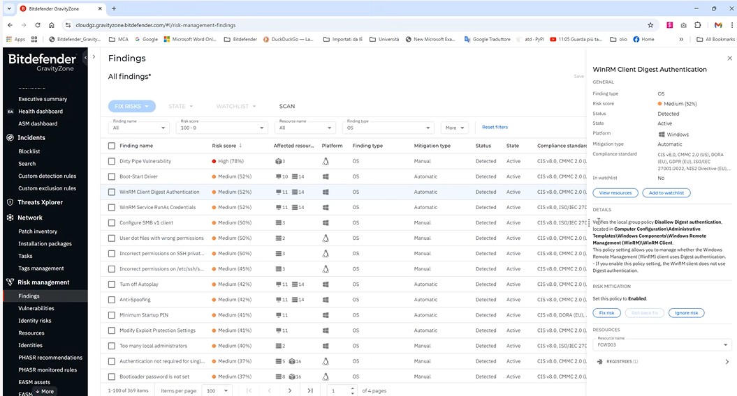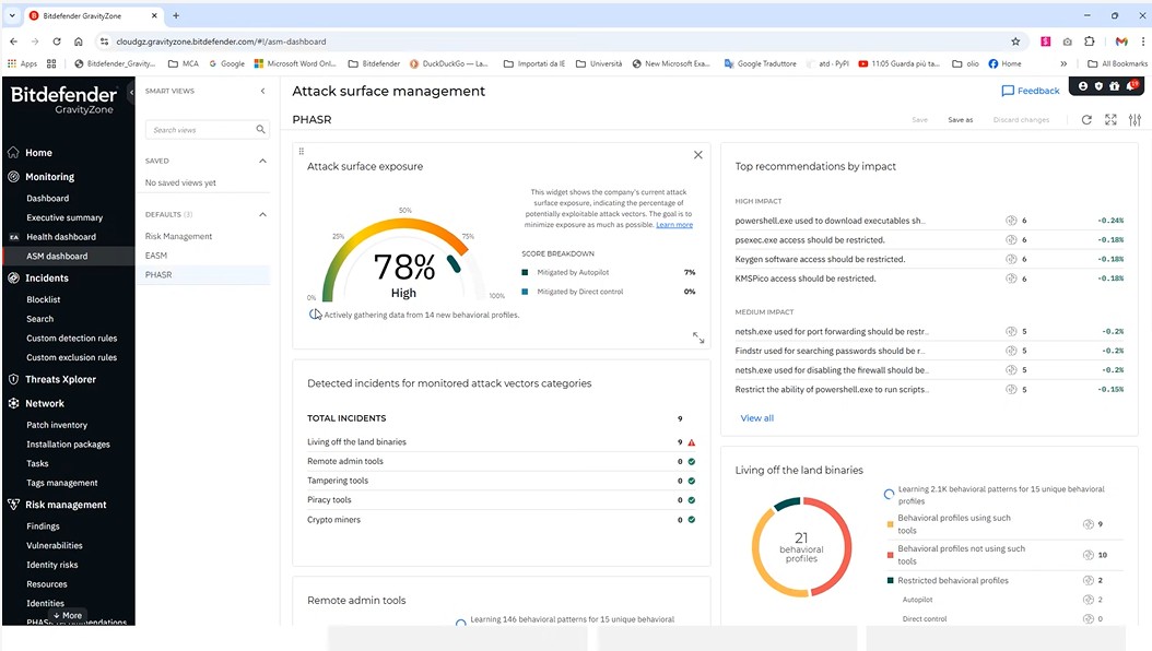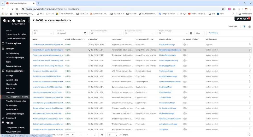 La gestione di PHASR avviene tramite la dashboard centralizzata ASM (Attack Surface Management), accessibile dalla console GravityZone. Qui sono riuniti tutti gli strumenti per la riduzione della superficie d’attacco: oltre a PHASR, sono visibili i moduli per il risk management, il controllo delle misconfigurazioni e delle vulnerabilità, la valutazione della compliance normativa e molto altro. A tale proposito, Risk Management è in grado di rilevare vulnerabilità su sistemi e software e di attribuire priorità alle correzioni. La segnalazione delle misconfigurazioni viene redatta in conformità con gli standard CISv8..
