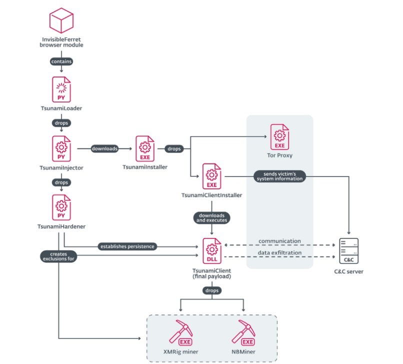 Non finisce qui perché nel novembre 2024 i ricercatori ESET scoprono una nuova versione del malware InvisibleFerret, caratterizzata da un modulo browser-data stealer modificato che contiene un blocco codificato precedentemente assente, che al suo interno ingloba il primo stadio di una catena di esecuzione che distribuisce un toolkit malware completamente nuovo, anch'esso destinato al furto di informazioni e criptovalute, che è stato battezzato TsunamiKit.