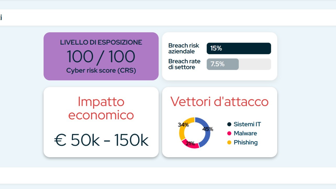 Il cuore dell’offerta ruota attorno a quattro servizi principali che, integrati tra loro, compongono una suite in modalità SaaS per la gestione globale del rischio cyber.Cyber Risk Investigation è il cuore della threat intelligence di nuova generazione: un modulo che scandaglia Web, Deep Web e Dark Web per intercettare qualsiasi traccia digitale legata all’azienda — dalle credenziali compromesse ai domini esposti, fino ai dati sensibili trafugati. Oltre a individuare le minacce, il sistema elabora una stima del potenziale danno economico legato alle informazioni rilevate e include nel report finale un piano di remediation dettagliato, con le azioni prioritarie per mitigare il rischio e rafforzare la postura di sicurezza. Un vero e proprio radar che monitora in tempo reale l’esposizione aziendale e trasforma i dati in insight operativi.