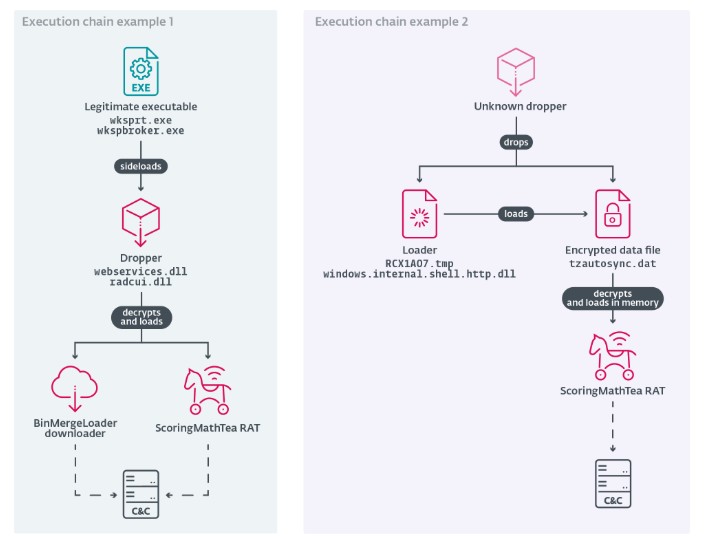 Esempi di catene di attacco di Operation DreamJob 2025 che distribuiscono BinMergeLoader e ScoringMathTea