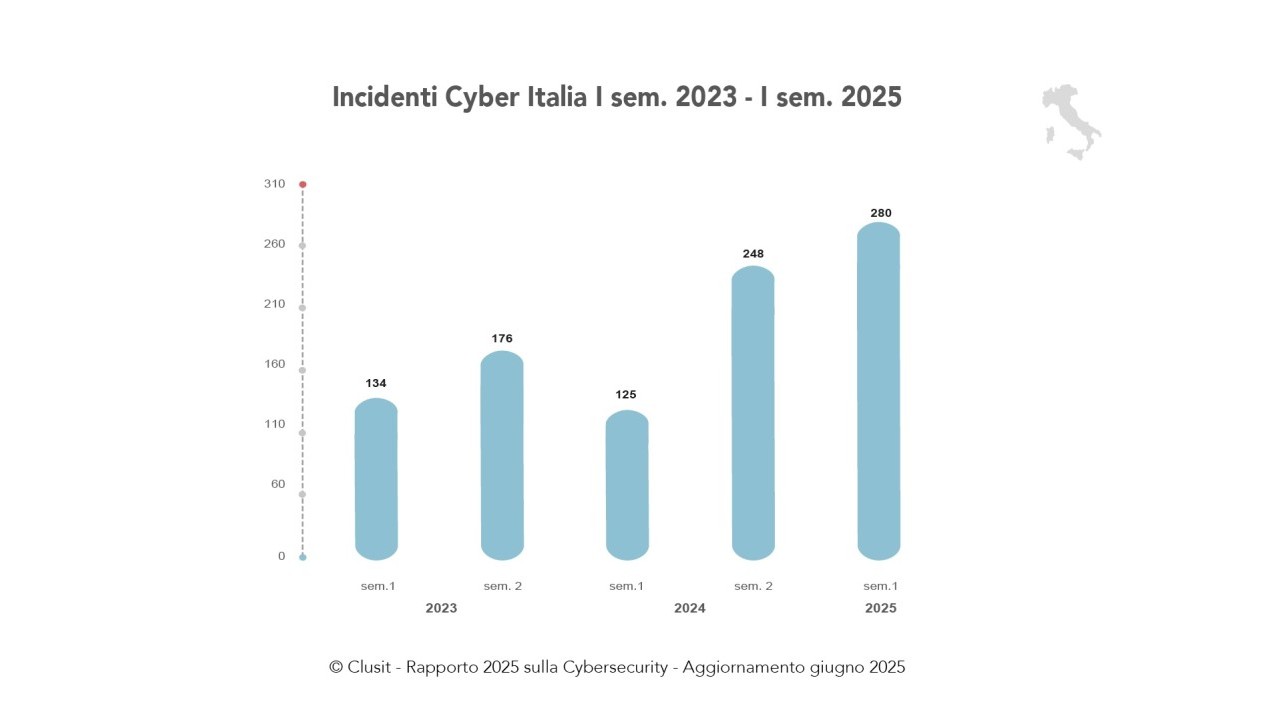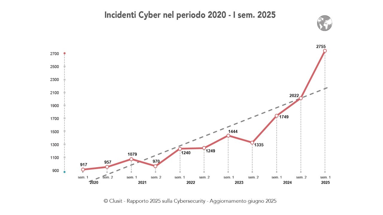 Il Clusit, l’Associazione Italiana per la Sicurezza Informatica, ha reso nota la tredicesima edizione del suo Rapporto – la seconda nel 2025 - incentrata sul primo semestre 2025: periodo in cui gli incidenti cyber rilevati nel mondo sono saliti a 2755, con un nuovo forte aumento (+36%) rispetto al semestre precedente (il secondo del 2024), mentre in Italia l’aumento è stato “solo” del 13%, con 280 incidenti.