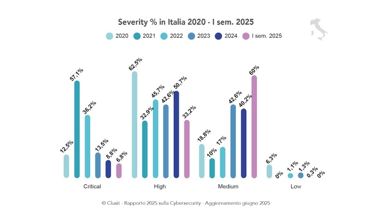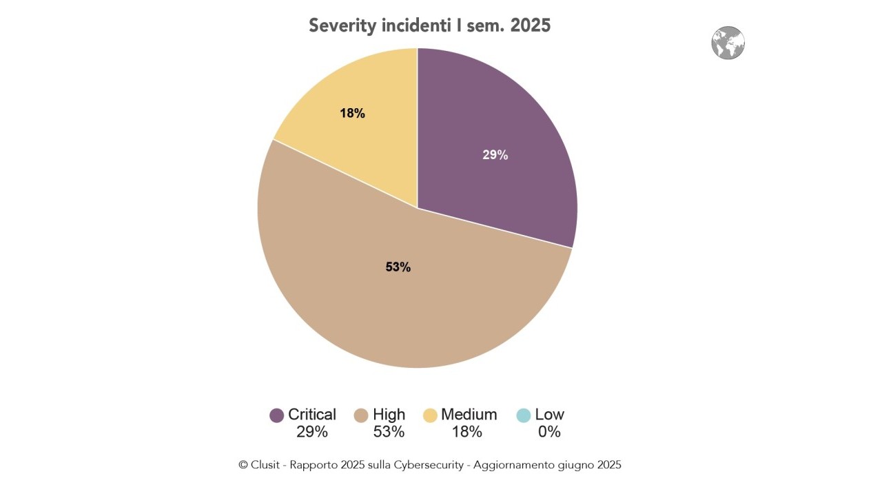 I ricercatori di Clusit evidenziano che anche la gravità (severity) degli incidenti nel mondo è in crescita: l'impatto medio stimato nel mondo è stato infatti “critico” o “elevato” nell’82% dei casi, contro il 77% del 2024 e il 50% del 2020.