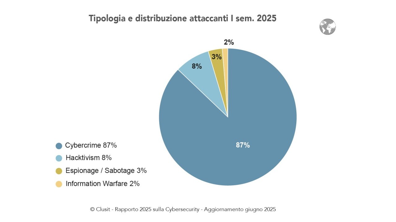 Secondo il Clusit, la crescita in volume degli incidenti nel mondo è sostenuta da un aumento del fenomeno Cybercrime, causa di 2401 incidenti, ovvero l'87% del totale nel primo semestre del 2025, e il 76% degli eventi Cybercrime di tutto il 2024.