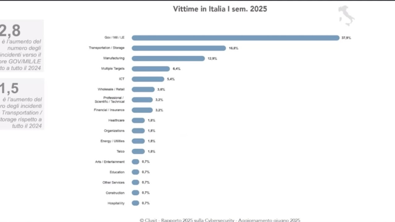 Nel primo semestre di quest’anno il Clusit ha rilevato un maggior numero di incidenti cyber nell’ambito Governativo/Militare/Forze dell’Ordine italiano (38% del totale), quasi il quadruplo rispetto all’intero anno precedente.