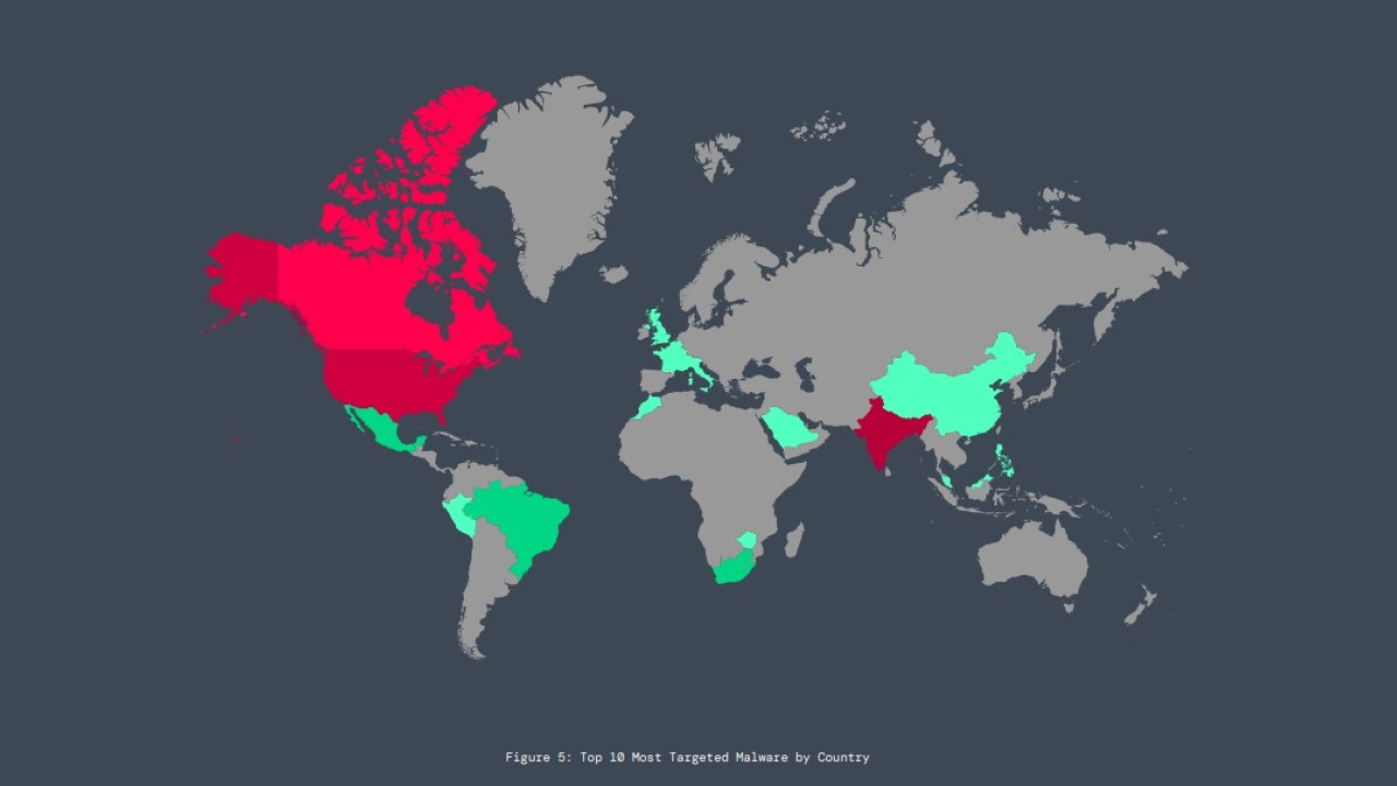 Per il segmento IoT, il baricentro si sposta in maniera netta verso gli Stati Uniti, che rappresentano il 54,1% del traffico di malware IoT osservato, assumendo il duplice ruolo di hub di attività e bersaglio principale. Dietro gli USA compaiono Hong Kong con il 15%, la Germania con il 6%, l’India con il 5% e la Cina con il 4%, una distribuzione che riflette la densità di infrastrutture connesse e il grado di esposizione dei dispositivi nelle diverse regioni.