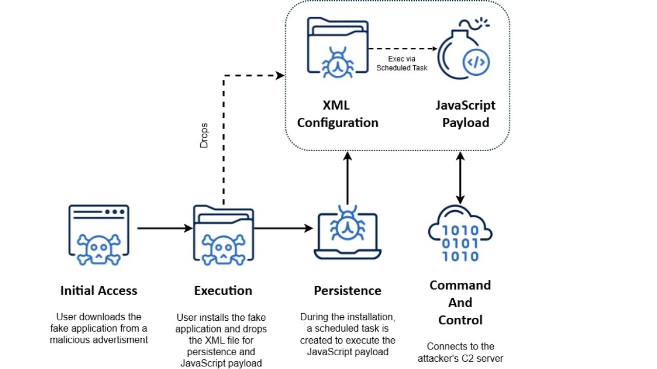 L’esperienza lato utente è studiata per essere indistinguibile da quella di un software legittimo: una volta avviato, l’installer mostra una classica finestra di licenza, procede con il setup, crea le directory previste, copia i file del programma e, al termine, apre persino una pagina di ringraziamento nel browser per rinforzare la percezione di normalità. In parallelo, il componente malevolo deposita un file XML in una directory temporanea o di installazione, che viene usato per creare una scheduled task su Windows: questo sposta il cuore dell’attacco fuori dal binario principale e sfrutta una funzionalità standard del sistema operativo per mantenere la persistenza. L’applicazione installata, peraltro realmente funzionante, riduce ulteriormente il sospetto: l’utente ottiene quello che si aspettava, mentre in background è già attivo un meccanismo che esegue periodicamente il payload JavaScript senza ulteriori azioni manuali.