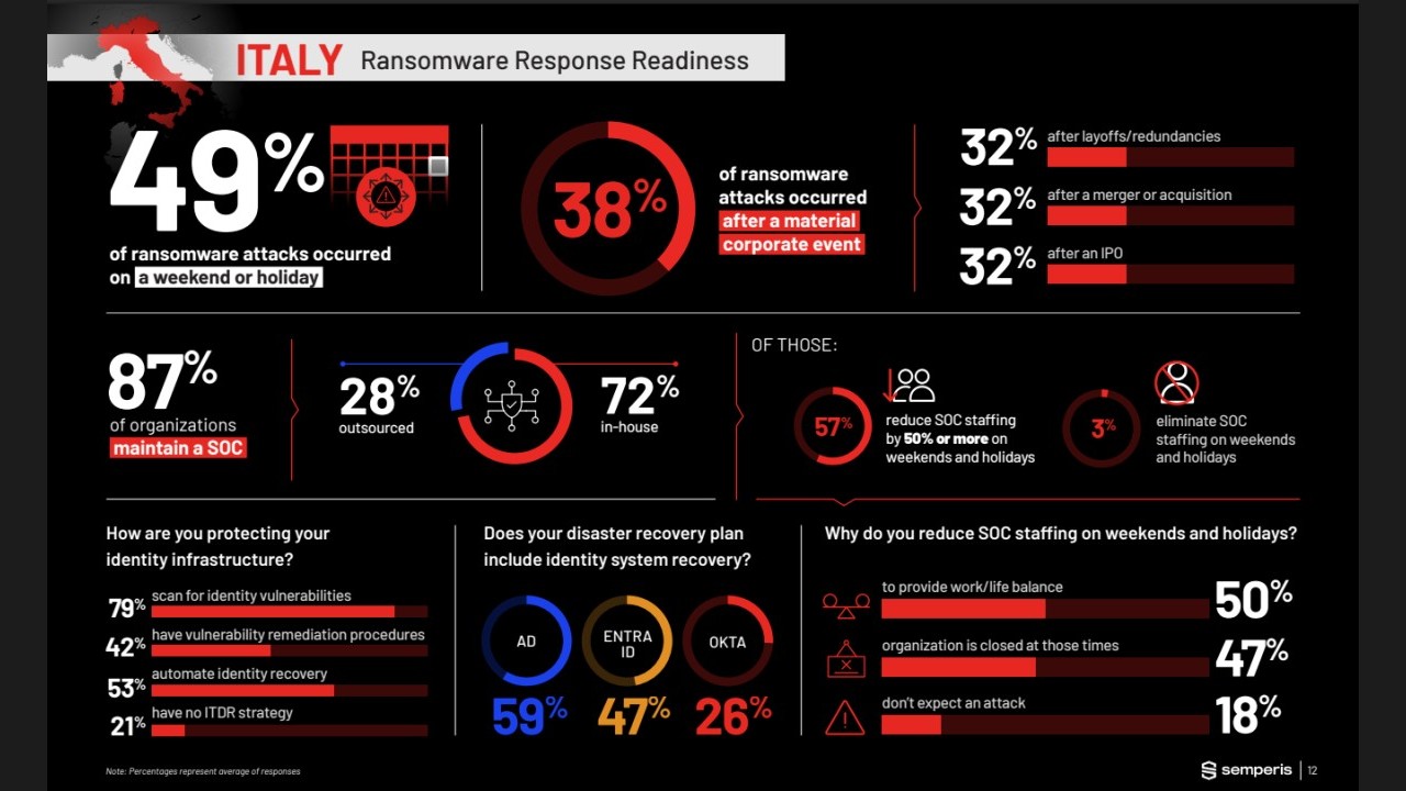 Per quanto concerne l’Italia, il report evidenzia una situazione in parte diversa ma non meno critica: il 49% degli attacchi ransomware ha avuto luogo durante un fine settimana o un giorno festivo, con una incidenza in calo rispetto al 58% rilevato nell’edizione precedente. Il 38% degli attacchi è avvenuto dopo un evento aziendale rilevante come quelli a cui si è accennato sopra. L’Italia si distingue per la percentuale più bassa di aziende dotate di SOC tra i Paesi analizzati: solo l’87% dichiara di avere un centro operativo di sicurezza interno, e tra queste il 28% si affida a una gestione esternalizzata. Anche laddove un SOC esiste, la copertura durante i periodi critici resta insufficiente: il 57% delle organizzazioni con SOC riduce il personale di almeno il 50% nei weekend e nei giorni festivi, e il 3% non dispone di alcuna risorsa attiva in quelle fasce temporali.