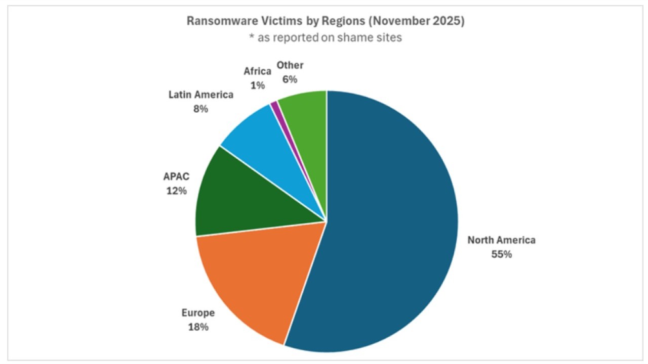 Il ransomware resta una delle minacce più distruttive e pervasive. Nel solo mese di novembre sono stati segnalati 727 incidenti ransomware a livello globale, con un incremento del 22% su base annua. In Nord America di concentra il 55% di tutti i casi, seguito dall’Europa con il 18%. Gli Stati Uniti restano il principale obiettivo con il 52% degli incidenti mondiali, seguiti da Regno Unito (4%) e Canada (3%).