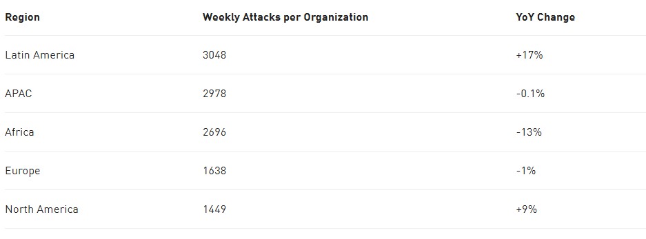 Dal punto di vista geografico, l’America Latina è l’area più colpita, con 3.048 attacchi per organizzazione a settimana (+17% su base annua). In Europa, dove si registra una leggera diminuzione dell’1%, l’Italia si conferma tra i Paesi più esposti, mentre in Nord America gli attacchi sono aumentati del 9%, anche a causa della crescita dei casi di ransomware.
