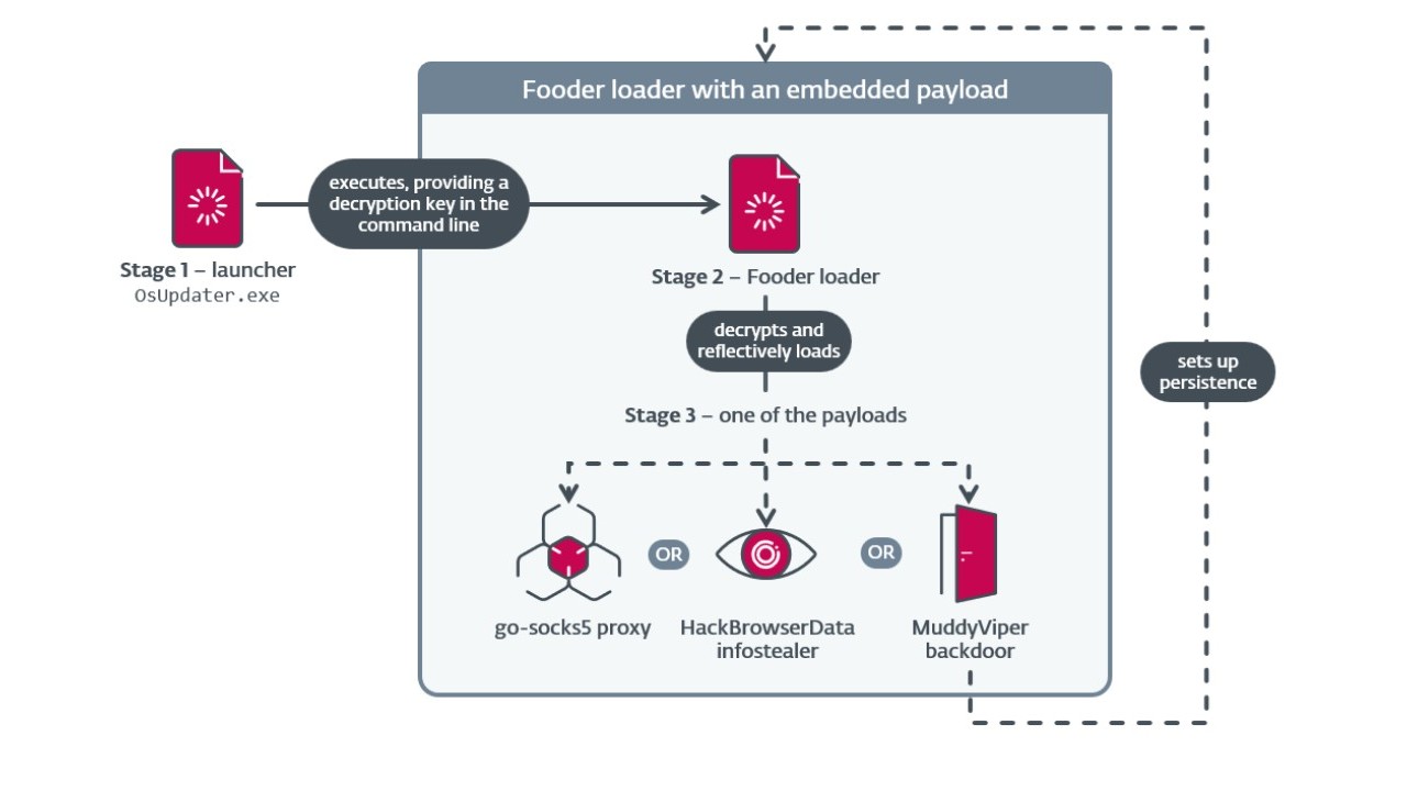 L’evoluzione tecnica di questa campagna è costituita da Fooder, un loader personalizzato che maschera le proprie funzionalità malevole dietro all’apparenza innocua di un’applicazione simile al classico gioco Snake. Non a caso, diverse varianti del malware si presentano come eseguibili ludici o utility prive di apparente rilevanza; in realtà implementano la logica necessaria per caricare in memoria la backdoor MuddyViper, senza bisogno di scrivere il payload su disco.