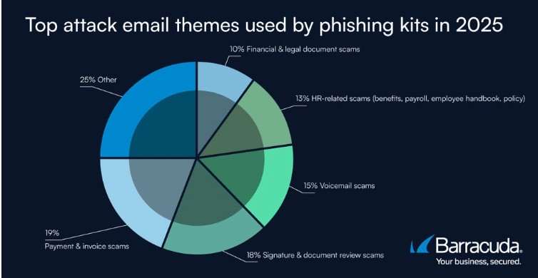 Stringendo il campo sulle classiche email di phishing, anche i temi che sono andati per la maggiore nel 2025 sono sempre gli stessi: una su cinque ha riguardato truffe legate a pagamenti e fatture, una percentuale identica faceva perno su firme digitali e revisione di documenti. Il 13% richiamava a documenti HR. La differenza rispetto al passato era un’esecuzione sempre più accurata sul piano grafico e testuale.