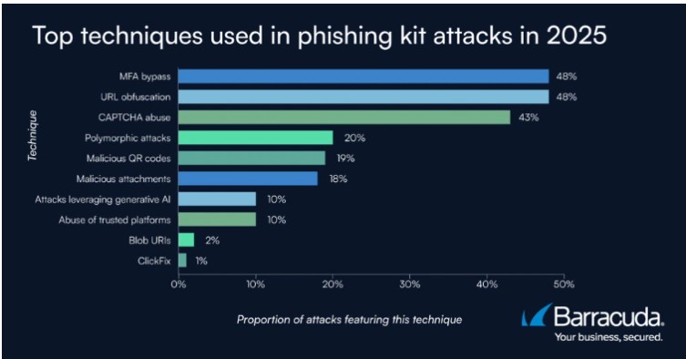 L’analisi di Barracuda elenca con precisione gli strumenti e le tecniche più diffuse utilizzate dai kit attivi nel 2025, individuando i meccanismi che hanno reso il phishing così difficile da intercettare. Nel 48% degli attacchi sono state implementate tecniche per eludere l’autenticazione a più fattori. Nella stessa percentuale di attacchi erano presenti tecniche di offuscamento degli URL. La somma delle due percentuali costituisce la fotografia del doppio fronte su cui si muovono i kit PhaaS: aggirare le protezioni dell’identità e nascondere la destinazione dei link malevoli.