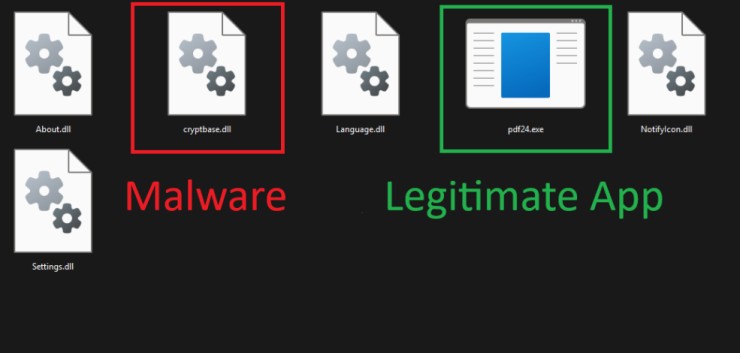 I ricercatori di Resecurity hanno analizzato tutta la catena di attacco. Le email iniziali di spear‑phishing invitano le vittime a scaricare un archivio ZIP che contiene l’eseguibile PDF24 App apparentemente legittimo, firmato con un certificato valido. PDF24 Creator è un software diffuso e legittimo per la creazione e la conversione di file PDF. Una volta avviato, all’apparenza il programma si comporta come da aspettativa; il problema è che in background l’eseguibile sfrutta vulnerabilità note del software PDF24 per caricare in modo silente la libreria malevola cryptbase.dll, che viene posizionata nella stessa directory del file legittimo. Quando il programma viene eseguito, la DLL dannosa viene preferita a quella omonima e innocua per una semplice questione di ordine di ricerca delle DLL in Windows.