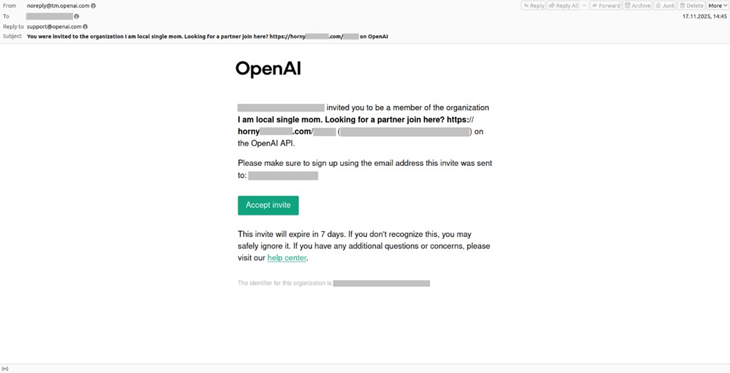 Creata l’organizzazione, la piattaforma mette a disposizione la funzione “invita il tuo team” che è ovviamente pensata per aggiungere collaboratori legittimi a un progetto, inserendo liberamente indirizzi email esterni. È qui che si attua la truffa, perché gli indirizzi inseriti sono quelli delle vittime prese di mira per la campagna di spam. Di fatto, gli ignari destinatari ricevono una email dall’infrastruttura di OpenAI, che è un mittente riconducibile a un dominio autentico e affidabile, che supera molti controlli automatici.