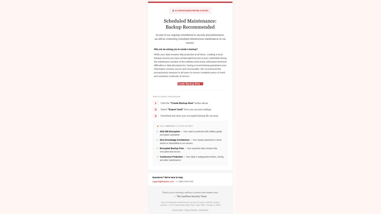 LastPass ha pubblicato un avviso ufficiale per segnalare ai propri clienti una nuova campagna di phishing attiva che prende di mira gli utenti del servizio di gestione password, con l’obiettivo di indurli a rivelare la propria master password. Nella comunicazione si fa riferimento a un attacco di social engineering ben costruito: il messaggio si presenta come una comunicazione ufficiale di LastPass che annuncia un’imminente sessione di manutenzione del servizio. Gli oggetti delle email fraudolente sono LastPass Infrastructure Update: Secure Your Vault Now, Your Data, Your Protection: Create a Backup Before Maintenance, oppure Important: LastPass Maintenance & Your Vault Security.