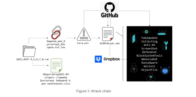 La campagna in questione ha inizio con esche ordinarie, progettate per mimetizzarsi nel flusso di lavoro quotidiano: documenti a tema business e archivi compressi che sembrano destinati all’amministrazione o alla contabilità. Dentro agli ZIP c’è la vera minaccia: un file LNK con doppia estensione che ha tutta l’aria di una banale comunicazione interna, ma che alla prima apertura esegue un comando PowerShell incaricato di collegarsi a un repository GitHub e scaricare uno script di prima fase.