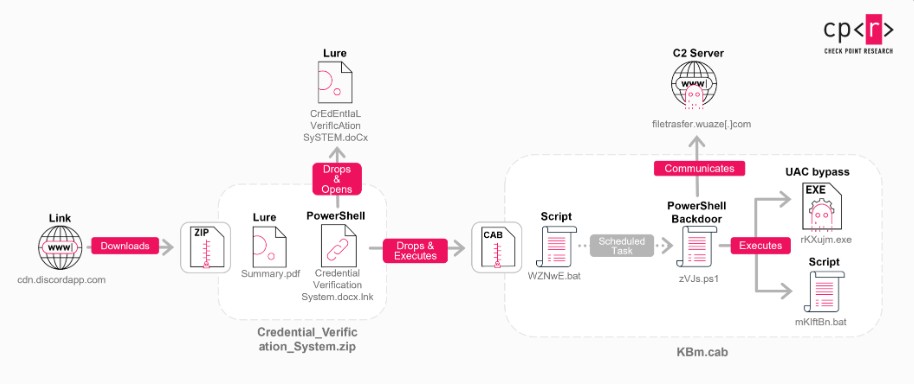 Più nel dettaglio, gli attaccanti hanno preparato archivi ZIP che simulavano documentazione di progetto o requisiti tecnici, caricati sulla CDN di Discord per sfruttare l’affidabilità percepita della piattaforma. All’interno degli archivi hanno inserito due elementi: un documento PDF di esca e un file LNK. L’utente crede di aprire un documento ordinario legato a temi progettuali ma, nel farlo, innesca l’esecuzione della catena di infezione. Come accade spesso, il file LNK lancia un loader PowerShell che estrae due file: un documento Word, che viene aperto per offrire alla vittima un contenuto plausibile e non destare sospetti, e un archivio CAB al cui interno è celata la backdoor PowerShell vera e propria, due script batch e un eseguibile usato come componente di supporto per il bypass dell’UAC. Il primo script batch ha il compito di preparare l’ambiente, instaurare la persistenza e avviare la backdoor in modo che sopravviva al riavvio del sistema.