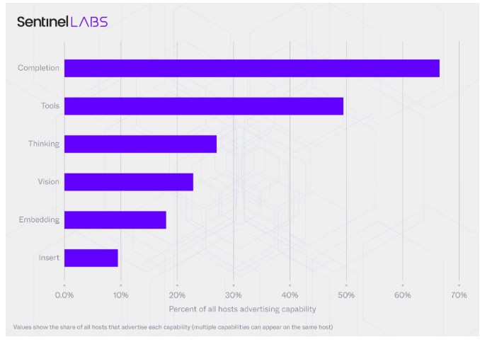 Che cosa fanno, in concreto, questi server? Quasi la metà degli host monitorati è configurata con funzionalità di tool‑calling, con la capacità di richiamare funzioni esterne, eseguire codice, chiamare API o interagire con altri sistemi. In altre parole, possono diventare veri e propri orchestratori di azioni e, in caso di abuso tramite compromissione, prompt injection o sfruttamento di misconfigurazioni, sono in grado di attuare operazioni concrete su asset interni o servizi esterni accessibili dal server.