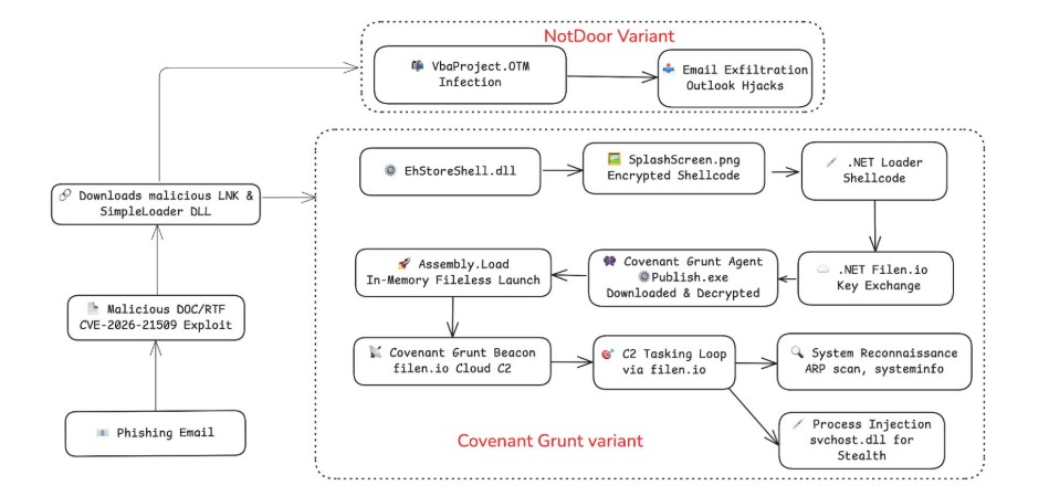 Dopo la fase di exploit, la campagna entra nel vivo con il download di un collegamento LNK malevolo e di una DLL che funge da primo loader. Questo componente stabilisce le basi per una catena multi‑stadio particolarmente articolata, che può evolvere in due direzioni: attivare una backdoor per Microsoft Outlook basata su macro VBA, chiamata NotDoor, oppure caricare un impianto C++ personalizzato chiamato BeardShell. In entrambe le varianti, l’obiettivo è riuscire a eseguire in memoria codice controllato dagli attaccanti, riducendo le tracce su disco e aumentando le possibilità di eludere le analisi forensi più superficiali.