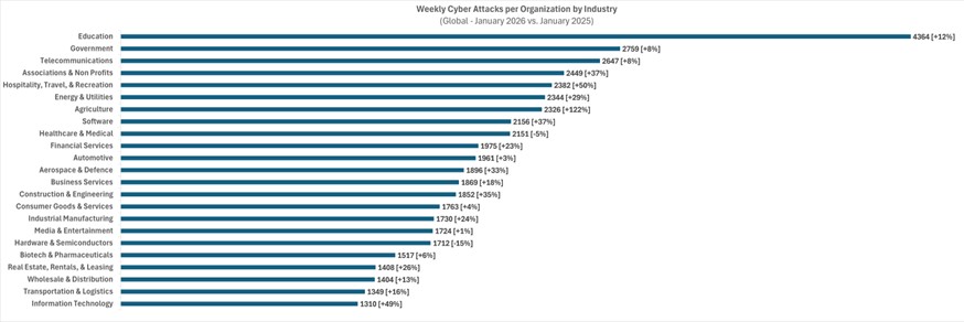 A gennaio 2026 in Italia si sono registrati in media 2.403 attacchi informatici a settimana, in crescita del 3% su base annua. Lo rileva Check Point Research, che segnala come questo volume superi del 14,98% la media globale, ferma a 2.090 attacchi settimanali nello stesso periodo. Il focus sull’Italia offre una fotografia chiara del contesto in cui si muovono aziende e cittadini. Check Point Research sottolinea come il nostro Paese resti un bersaglio privilegiato, con gli operatori ransomware che spingono sull’acceleratore e l’uso non governato della GenAI apre nuovi punti ciechi per le organizzazioni. Un quadro che per l’Italia è particolarmente complesso da gestire, perché l’apparente resilienza convive con vulnerabilità strutturali che espongono settori critici e infrastrutture chiave.