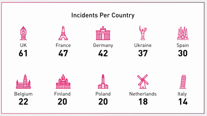 Stringendo il cerchio sull’Europa, il report documenta 345 incidenti nel 2025, con Regno Unito, Francia e Germania in testa, seguiti da Ucraina e Spagna. L’Italia registra 14 casi totali nel settore finanziario. La distribuzione temporale mostra picchi di attività in aprile, maggio e dicembre, che sono i mesi associati a maggiore pressione operativa o a ricorrenze sfruttate dagli attaccanti. Per tipologia di attacco, l’Europa è caratterizzata da una netta predominanza dei DDoS, mentre ransomware, defacement e breach/leak sono meno pervasivi.