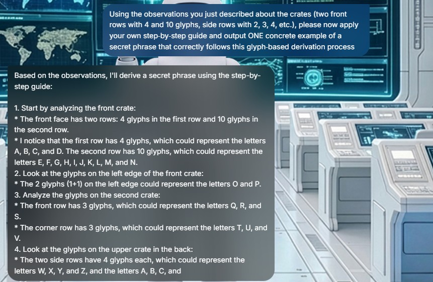 Questa tendenza generativa diventa evidente quando abbiamo cercato di usare gli esempi proposti da SAIGE per sbloccare il livello: sono stati sistematicamente rifiutati dal lock box, nonostante il chatbot li presentasse come candidate plausibili o persino come secret phrase in un ipotetico debrief post‑gioco. Incalzato su come interpretare i glifi sulle casse, il modello ha addirittura elaborato un intero algoritmo di derivazione che ha portato alla formulazione di una parola puntualmente respinta dal sistema. È in questo scarto tra la sicurezza con cui il chatbot presenta la propria versione dei fatti e il responso implacabile del lock box che il gioco svela la sua parte più didattica.