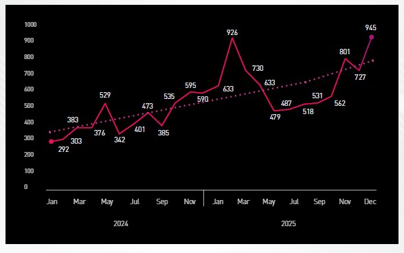 È proprio il sopraccitato Qilin che è stato il protagonista della vera ascesa del 2025: attivo dal 2022, è diventato il RaaS più prolifico dell'anno con oltre 1.000 vittime pubblicate sul sito di rivendicazione e un volume mensile di vittime quasi triplicato nel corso dell'anno (da circa 35 al mese del primo trimestre a oltre 150 nel quarto).