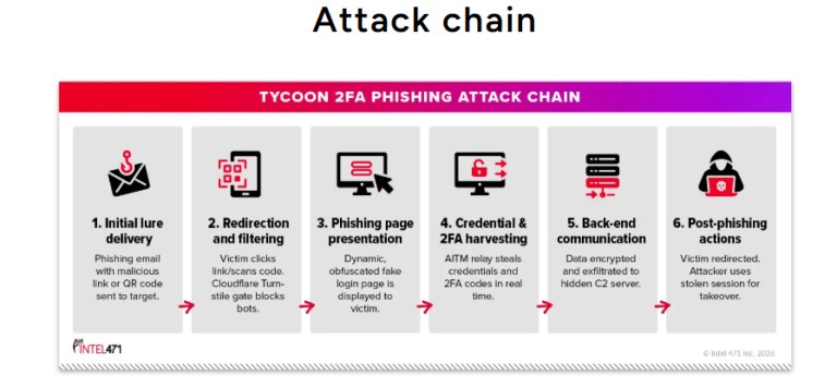 Per quanto riguarda la dimensione pura del fenomeno, fino a metà 2025 Microsoft ha bloccato oltre 30 milioni al mese di email legate a Tycoon 2FA. A ottobre 2025 la cifra ammontava a oltre 13 milioni di messaggi malevoli. Nel periodo compreso tra ottobre 2025 e gennaio 2026, il volume complessivo stimato di messaggi di phishing riconducibili al servizio in questione ha superato gli 87,5 milioni, con un impatto su oltre 500.000 organizzazioni nel mondo. Gli esperti di Intel 471 hanno collegato la piattaforma a oltre 64.000 episodi di phishing documentati.