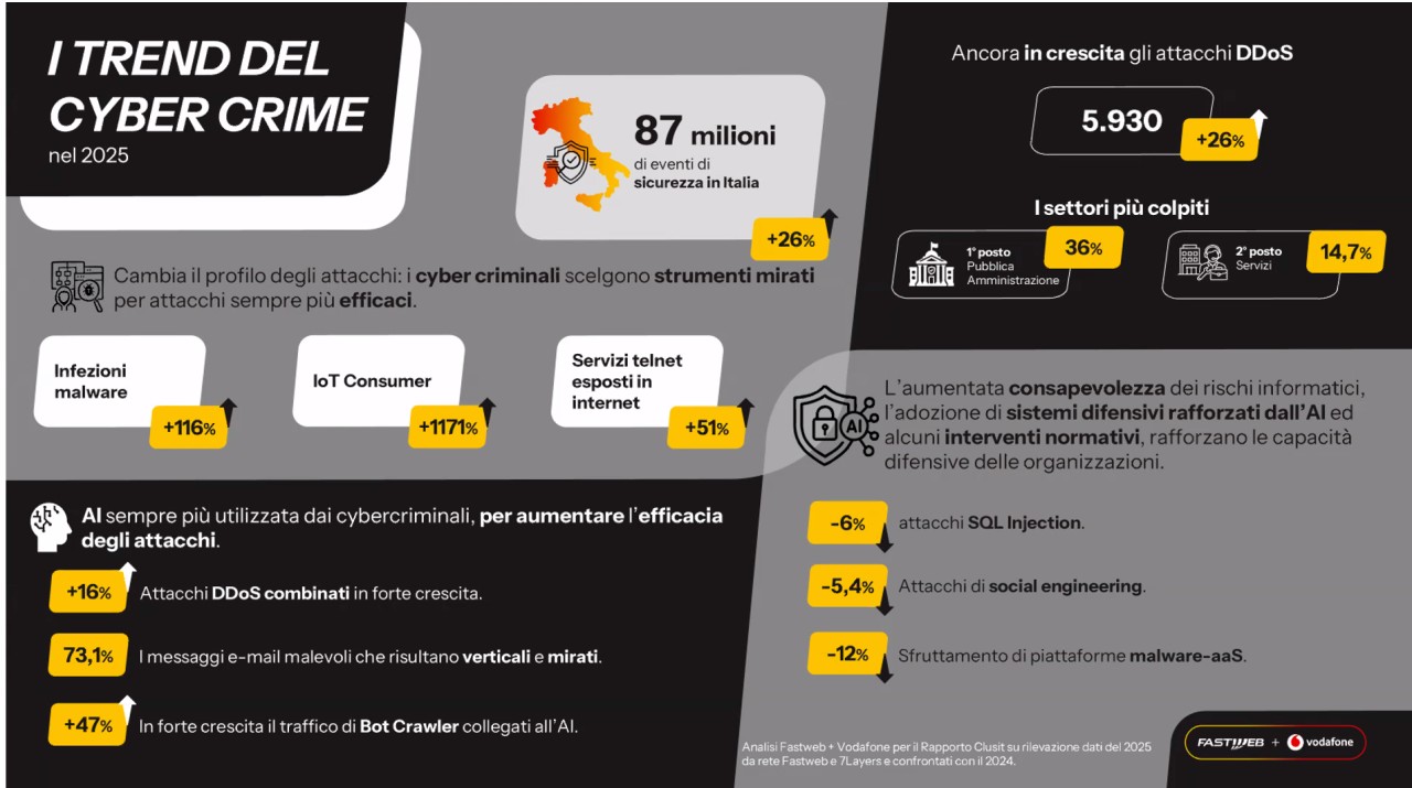 Nel 2025 Fastweb e Vodafone hanno rilevato sulla propria rete in Italia 87 milioni di eventi di sicurezza, il 26% in più rispetto all'anno precedente. Un numero che racconta un Paese sempre più nel mirino dei threat actor, ma che nasconde dinamiche più articolate rispetto a un semplice aumento lineare degli attacchi. I dati, elaborati con il supporto di 7Layers, sono stati presentati da Silvio Ferrari, Manager of Cyber Security products di Fastweb + Vodafone, nell'ambito del Rapporto Clusit 2026. Rispetto all’analisi di Clusit (che tiene conto solo degli attacchi andati a buon fine), in questo caso il conteggio riguarda tutto il traffico malevolo che transita sulla rete, inclusi i tentativi di attacco bloccati.