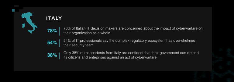 In Italia, il 34% dei responsabili IT ha dichiarato che la minaccia di cyberwarfare è imminente e di aver già dovuto segnalare almeno un attacco alle autorità. Il 39% degli intervistati ammette di reagire agli attacchi in modo reattivo, durante il loro verificarsi o dopo che il danno è già avvenuto. Il dato più legato all'impatto operativo è che il 44% dei professionisti IT italiani ha confermato che la propria organizzazione ha ritardato, sospeso o interrotto progetti di trasformazione digitale a causa delle minacce di cyberwarfare.