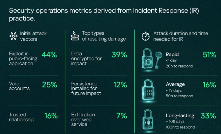 Per i clienti privi di protezione MDR, i dati IR mostrano che il 51% degli attacchi investigati è durato meno di un giorno, il 16% circa 19 giorni e il 33% ha avuto una durata mediana di 108 giorni. Gli attacchi rapidi, prevalentemente ransomware ad alta velocità, richiedono circa 20 ore di lavoro per la risposta all'incidente; quelli di durata media circa 50 ore; quelli di lunga durata fino a 100 ore. Il danno più frequente in tutti e tre i tipi è la cifratura dei file, cui si aggiungono nei casi più prolungati la persistenza per attacchi futuri, la compromissione di Active Directory e l'esfiltrazione di dati.