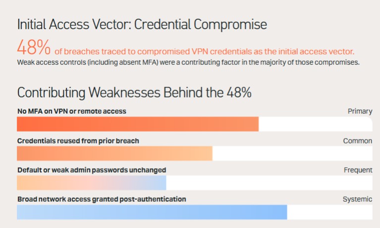 Il sesto errore è la dipendenza da modelli di accesso legacy. Il 48% delle violazioni analizzate da SonicWall nel 2025 è stato attribuito a credenziali VPN compromesse come vettore di accesso iniziale, con l'assenza di MFA come fattore contributivo primario. Le CVE relative ai VPN sono cresciute dell'82,5% nel periodo analizzato, con circa il 60% classificate ad alta o critica severità. Il 90% delle organizzazioni ha almeno un problema con la propria infrastruttura VPN attuale. Il modello network-first, basato su autenticazione unica e accesso ampio alla rete, è ormai inadeguato.