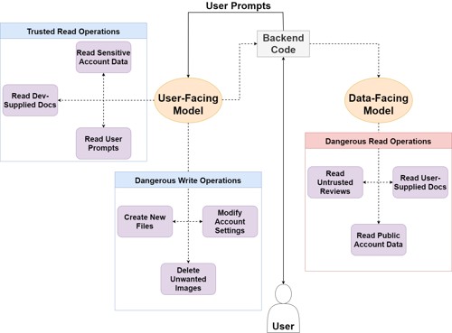 Schema del Gatekeeper Pattern, l’architettura che separa funzioni privilegiate e modelli esposti a dati non affidabili. Fonte: NCC
