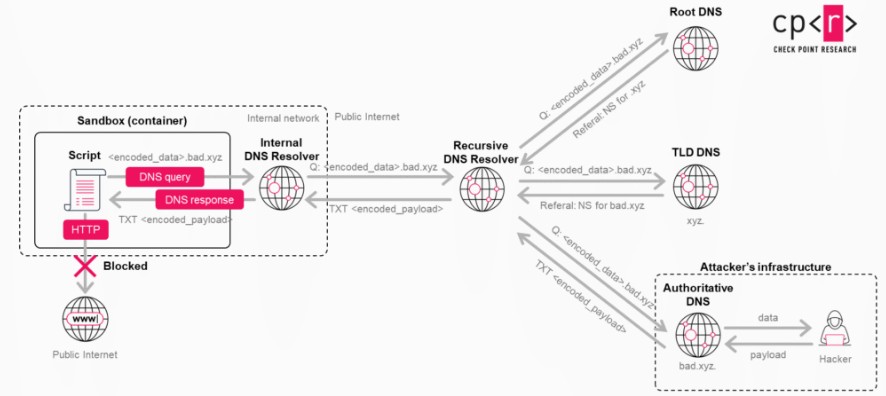 Gli esperti di Check Point hanno scoperto un modo per aggirare del tutto queste misure di sicurezza, sfruttando il DNS come un punto cieco. Sottolineiamo che il Domain Name System, inventato nella notte dei tempi, è di norma considerato una infrastruttura di servizio, non un canale dati. Il suo compito è banalmente risolvere nomi di dominio in indirizzi IP. Il guaio è che questa funzionalità era disponibile nell'ambiente in cui ChatGPT esegue il codice come parte del normale funzionamento del sistema, anche quando tutte le connessioni dirette in uscita erano bloccate. I ricercatori hanno dimostrato che in questo costrutto il DNS poteva essere sfruttato come meccanismo di trasporto nascosto, codificando informazioni nei nomi di dominio e innescando la loro risoluzione. Poiché la risoluzione DNS percorre normalmente una catena di server intermedi per arrivare a destinazione, quei server diventavano inconsapevoli vettori dei dati codificati.
