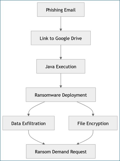 L'accesso iniziale avviene con il metodo tanto collaudato quanto efficace della email di phishing. In questo caso un link a Google Drive porta al download di un file JAR, ossia un archivio eseguibile per applicazioni Java. La telemetria EDR raccolta da Acronis ricostruisce la sequenza con precisione: la vittima riceve l'email in Outlook, clicca sul link; Chrome apre il file da Drive, javaw.exe (il runtime Java per Windows) esegue l'archivio. Vittime reali hanno segnalato lo stesso schema su forum pubblici come per esempio quello di BleepingComputer.