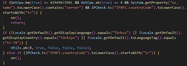 C’è poi un altro elemento da aggiungere. Prima di fare qualsiasi cosa, JanaWare verifica con precisione dove si trova controllando le impostazioni di lingua e la localizzazione del sistema operativo, quindi attua una controverifica indipendente tramite un servizio esterno per individuare la posizione della vittima dall’IP del sistema. Se il codice paese inizia con TR l’attacco prosegue, altrimenti si blocca senza causare danni.