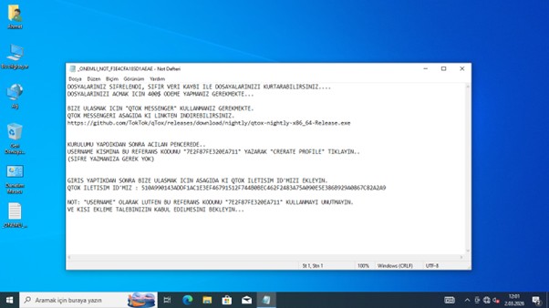 Al termine della cifratura, il malware deposita la nota di riscatto di 400 dollari in più cartelle, in lingua turca, fornendo istruzioni per contattare gli operatori. L'analisi statica delle classi Java conferma che non esiste una copia locale della chiave di decifratura e non esiste un modo per ricostruirla senza l'accesso diretto all'infrastruttura degli attaccanti, quindi senza pagare il riscatto è attualmente impossibile recuperare i file.
