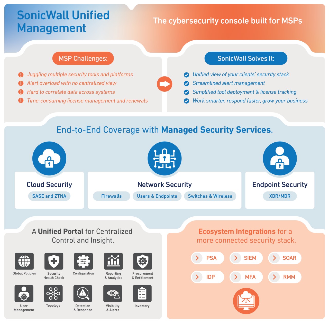 SonicWall Unified Management integra cloud security, network security ed endpoint security in un portale unico, con integrazioni native verso PSA, SIEM, SOAR, IDP e RMM