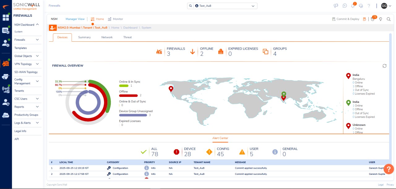 La dashboard di NSM offre una visione centralizzata dello stato di tutti i firewall gestiti, con alert, configurazioni e reportistica in un'unica console