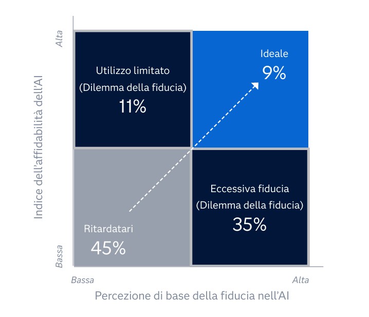 Il settore bancario sta adottando l'AI più velocemente degli altri, spendendo di più e con obiettivi ambiziosi. Eppure, quasi la metà delle banche globali opera in quello che si definisce "dilemma della fiducia": sistemi di AI implementati senza un'adeguata infrastruttura di governance, oppure strumenti già maturi lasciati inutilizzati perché l'azienda non si fida abbastanza. Solo l'11% degli istituti ha raggiunto l'allineamento ottimale tra fiducia interna nei sistemi e affidabilità dimostrabile degli stessi. Il 47% naviga in acque inesplorate.