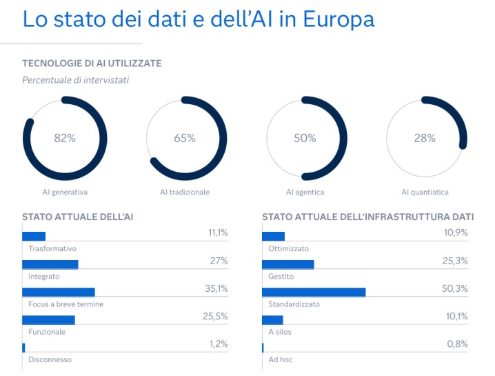 Il paradosso emerge dai dati sugli investimenti: nei prossimi mesi il 60% delle banche prevede aumenti di spesa in AI compresi tra il 4% e il 20%; un ulteriore 12% si aspetta incrementi ancora più marcati. Il settore cresce più in fretta di tutti gli altri inclusi nella ricerca. Purtroppo, questa accelerazione non è accompagnata da un rafforzamento proporzionale delle infrastrutture che rendono l'AI affidabile: quasi una banca su cinque (19%) opera ancora con architetture dati divise in silos, la percentuale peggiore tra tutti i verticali analizzati. Il 45% dichiara l'assenza di una data governance efficace; il 41% non dispone di un'infrastruttura dati centralizzata o ottimizzata. Il 42% segnala carenza di competenze specialistiche in ambito AI.