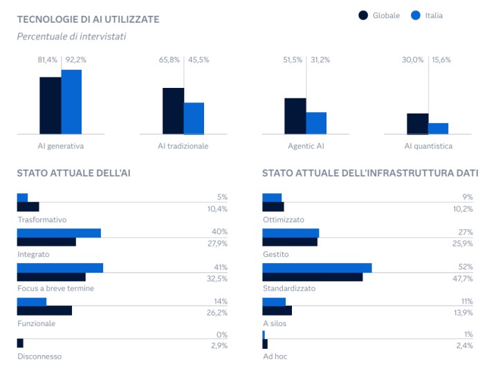 Nel contesto europeo, l'Italia si colloca in una posizione di medio ritardo sia sull'indice di affidabilità AI (2,73 su 5, tra i valori più bassi del continente) che sull'impatto dichiarato (3,01). La lettura comparata con i paesi che performano meglio, Irlanda in testa, indica che le organizzazioni italiane mostrano una base dati relativamente solida, con punti di forza ai livelli "standardizzato" e "gestito", e una quota di aziende con silos non integrati (11%) inferiore alla media globale (13,9%). Il nostro problema è il capitale umano. La carenza di personale qualificato in ambito AI viene segnalata con un'incidenza superiore di 12,8 punti percentuali rispetto alla media globale: è il primo ostacolo all'implementazione, staccato nettamente da tutti gli altri. Il limitato supporto del management (gap +4%), l'assenza di dipendenti con competenze specifiche (+1%) e la scarsa attenzione all'uso etico e all'equità dei sistemi (-5%) completano un quadro in cui i progressi dipendono più dalla capacità organizzativa che dalle risorse tecniche. Pesa anche il contesto normativo: le restrizioni sul processo decisionale automatizzato (+14%) e gli obblighi di localizzazione dei dati (+17,5%), sommati alla carenza di competenze, rendono la costruzione di sistemi AI scalabili un percorso oggettivamente più tortuoso che altrove.
