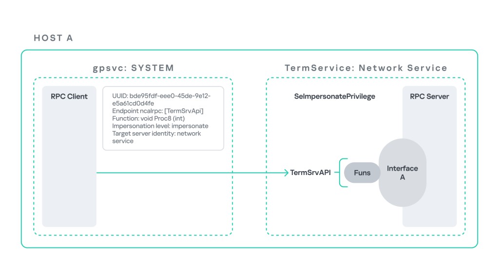 Il ricercatore di Kaspersky che ha trovato il bug ha dimostrato cinque percorsi di escalation concreti, partendo da diversi contesti di servizio. Il caso più diretto riguarda il servizio Group Policy Client, che gira sotto SYSTEM. L'attaccante ha già compromesso un processo con privilegi bassi (tipicamente un servizio di rete come un web server) - e da lì dispiega il suo server RPC fasullo, configurato per imitare l'endpoint del servizio Remote Desktop. Quando un amministratore forza l'aggiornamento delle policy di gruppo, il servizio Group Policy Client tenta automaticamente una chiamata RPC al servizio Remote Desktop. Quel servizio è disabilitato per default, quindi l'endpoint è libero e la chiamata arriva al server fasullo, che a quel punto impersona il processo chiamante e l'attaccante scala da privilegi di rete a controllo totale del sistema.