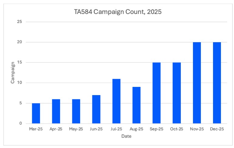Nel 2025 si è vista l’adozione di Tsundere Bot, un nuovo malware‑as‑a‑service con capacità di backdoor e loader, che TA584 ha iniziato a distribuire alla fine di novembre e poi ha usato in più campagne durante dicembre, in parallelo a XWorm. Nelle telemetrie di Proofpoint Tsundere Bot risulta già impiegato da altri threat actor da agosto 2025, a dimostrazione che TA584 non sviluppa in proprio tutti gli strumenti, ma seleziona quelli già disponibili e li integra in una pipeline di attacco molto rodata.